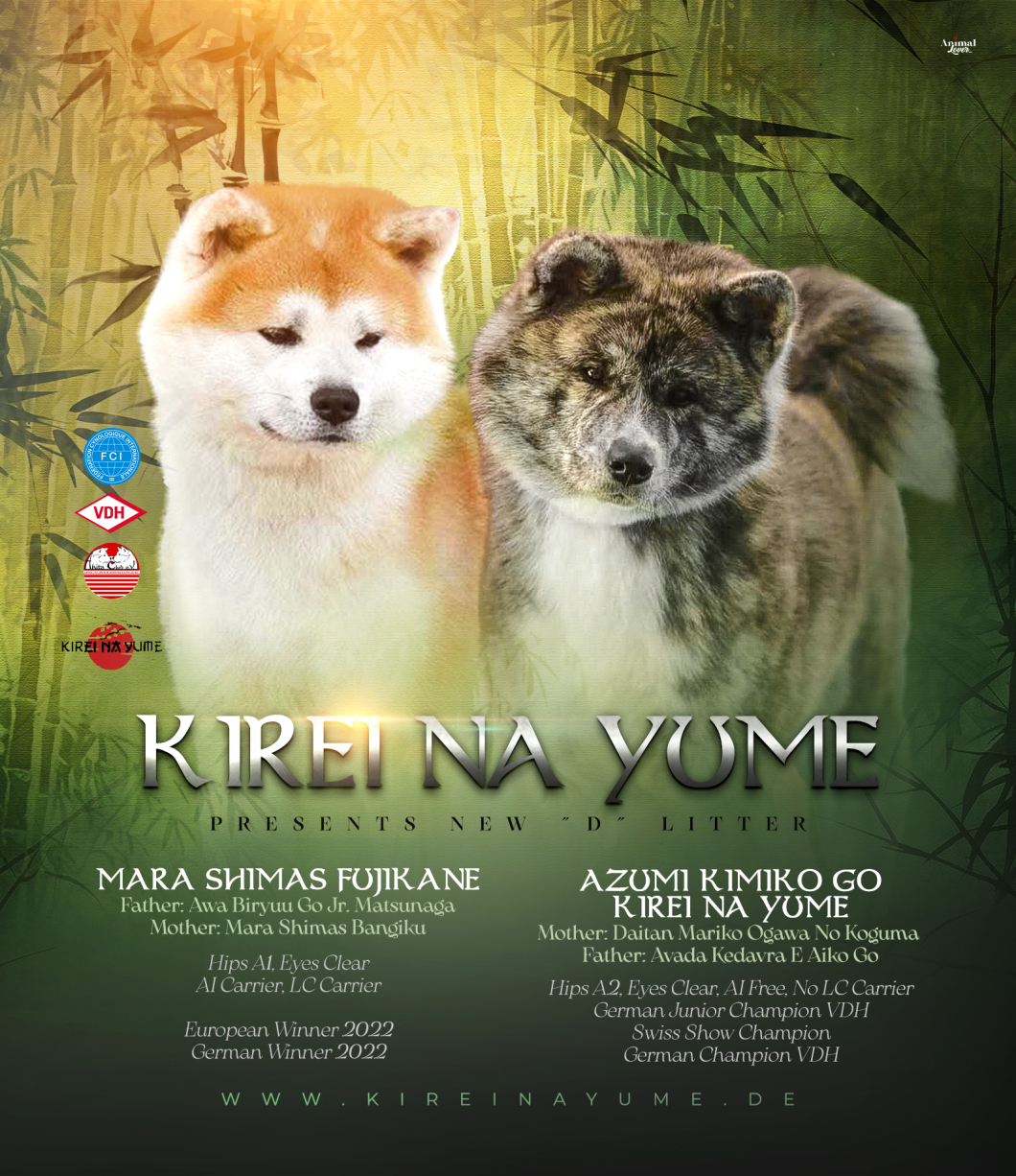 Die Zuchtstätte Kirei Na Yume wurde 2023 von der F.C.I. eingetragen und geschützt. Gezüchtet wird nach den Regeln des Akita Club e.V. unter dem Dachverband des VDH und damit im Rahmen der F.C.I. Selbstverständlich wurde die Zuchtstätte durch den Akita Club und das Veterinäramt geprüft.